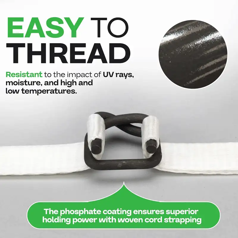 黑色磷化表面,防滑性能优异,与涤纶编织打包带结合紧密,确保运输中张力稳定、安全可靠。
