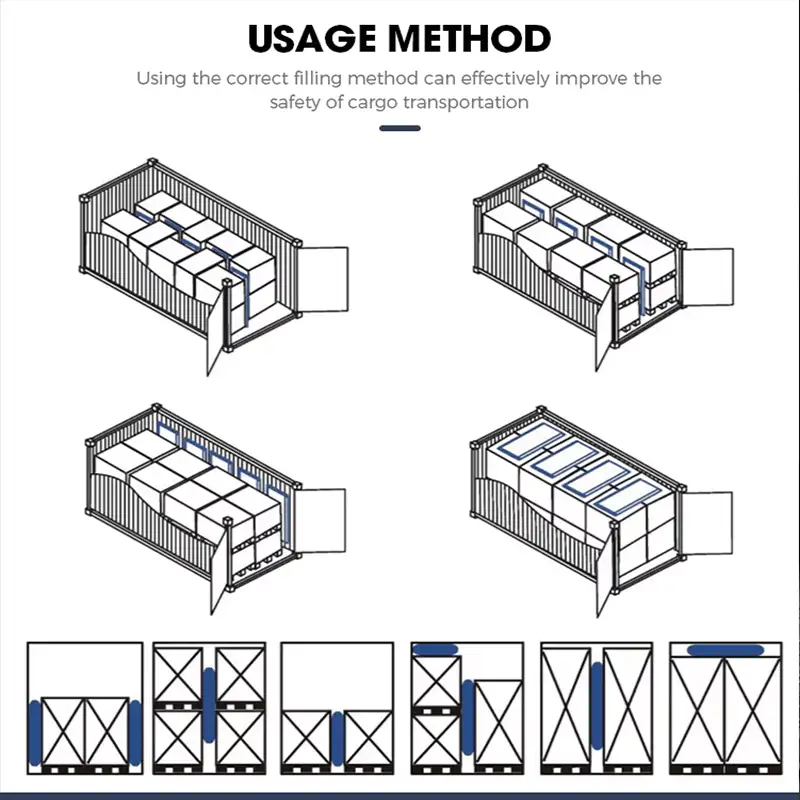 配备快速充放气专利阀,可调气压、反复使用,适用于海运集装箱、铁路与公路运输。支持尺寸/印刷/阀门类型定制与批量供货。