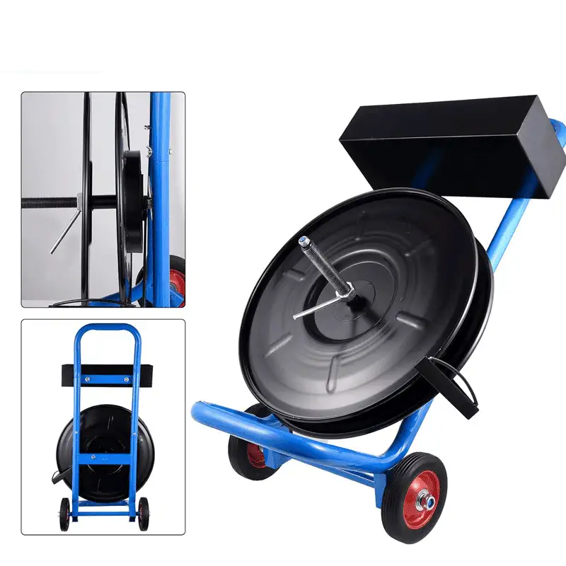 7.8英寸重型打包带手推车带盘车(蓝色)| 适配8″×8″卷芯 | 自带置物盘|C型推手|滚轮刹车系统|镀锌钢结构 防腐防水
