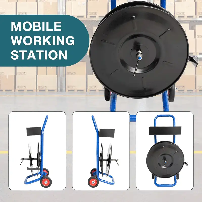 7.8″重型打包带手推车 集放带、移动与工具收纳于一体,专为 8″×8″卷芯 的 PP/PET/复合纤维/纤维/钢带而设计。整机采用镀锌钢结构+防腐防水涂层,搭配C型推手与大号橡胶轮,移动顺滑;滚轮刹车系统让放带更可控不打结,广泛适用于仓库、工厂与物流中心。